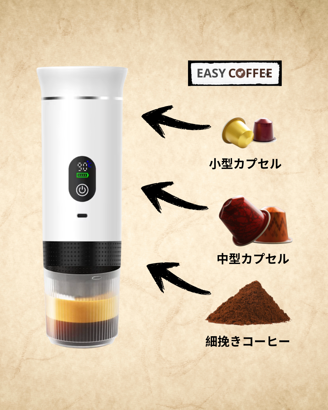 小型・中型カプセル、そして粉コーヒーにも対応しています。