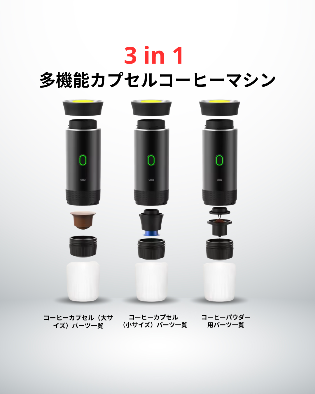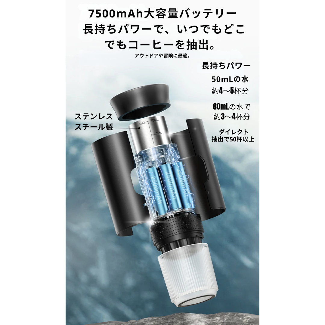 市販の多くのモデル(2000~4000mAh程度)とは異なり、一度の充電で50杯以上も抽出可能。アウトドアや電源のない場所でも、最後まで安定した高圧抽出を実現します。